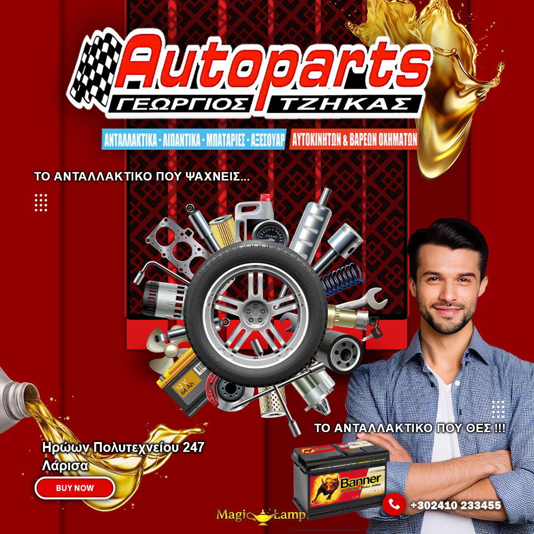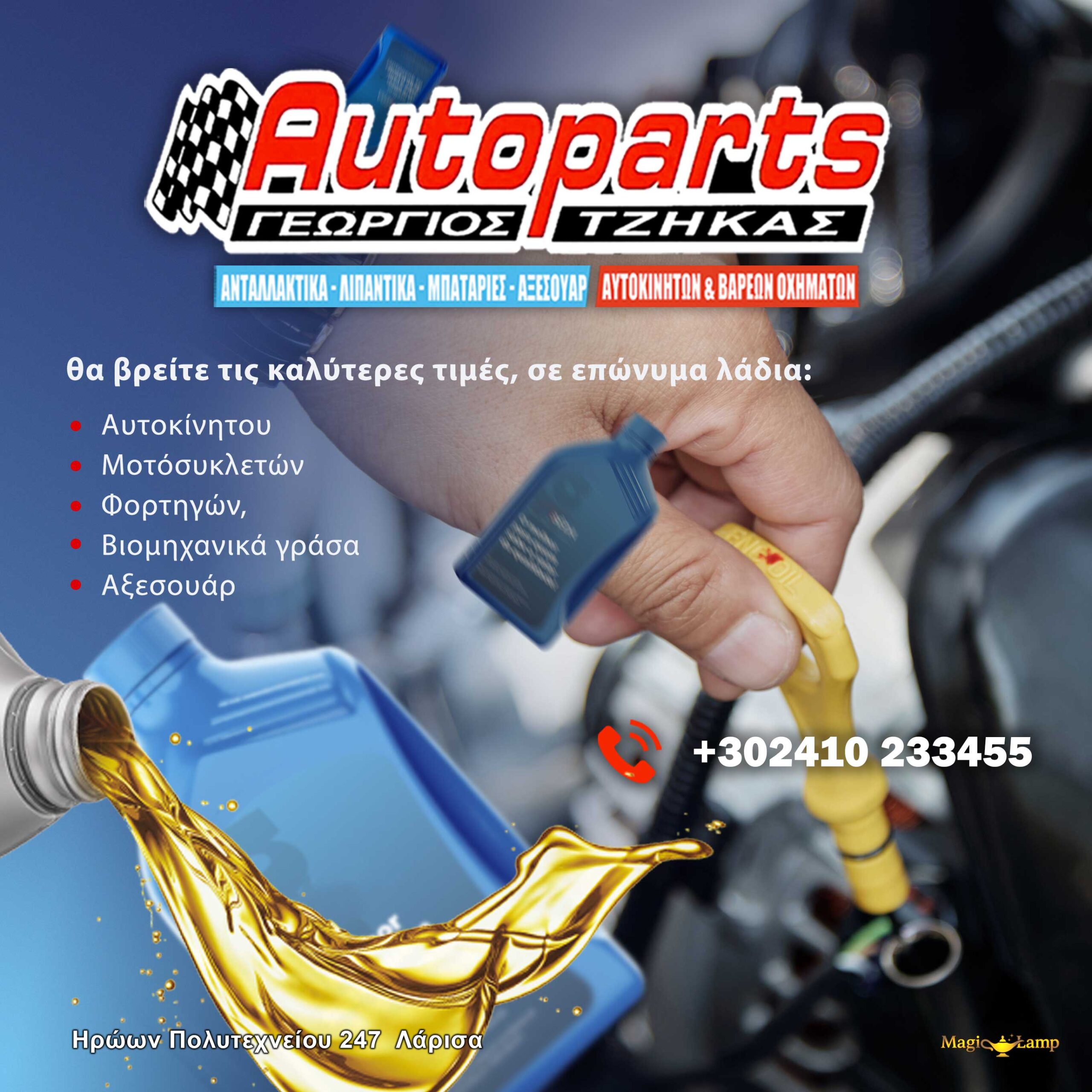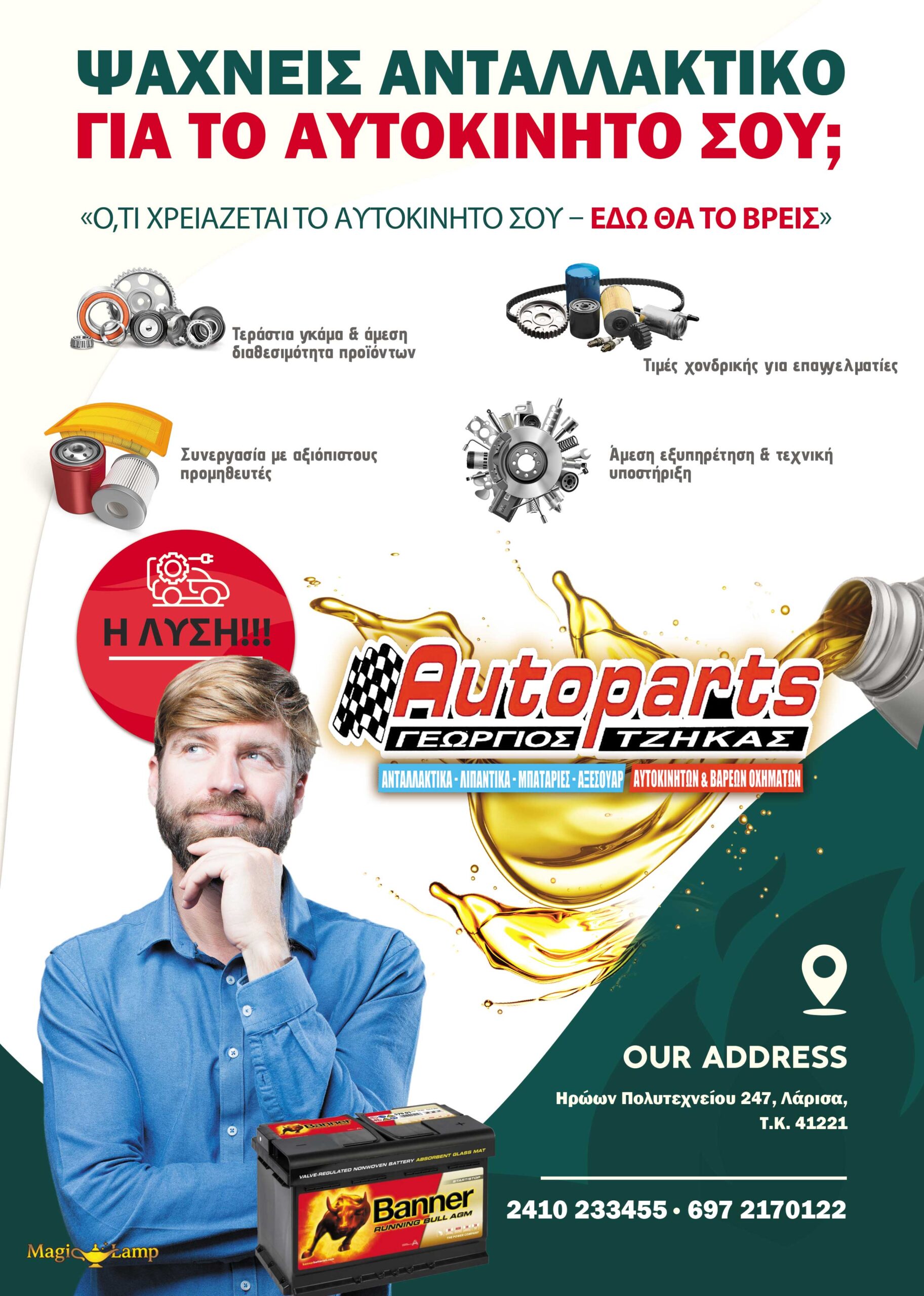 Η επιχείρηση AUTO PARTS Γιώργος Τζήκας, με έδρα στη Λάρισα (Ηρώων Πολυτεχνείου 247, Τ.Κ. 41221), δραστηριοποιείται συστηματικά στον χώρο των ανταλλακτικών αυτοκινήτων, φορτηγών, λιπαντικών, μπαταριών και αξεσουάρ.