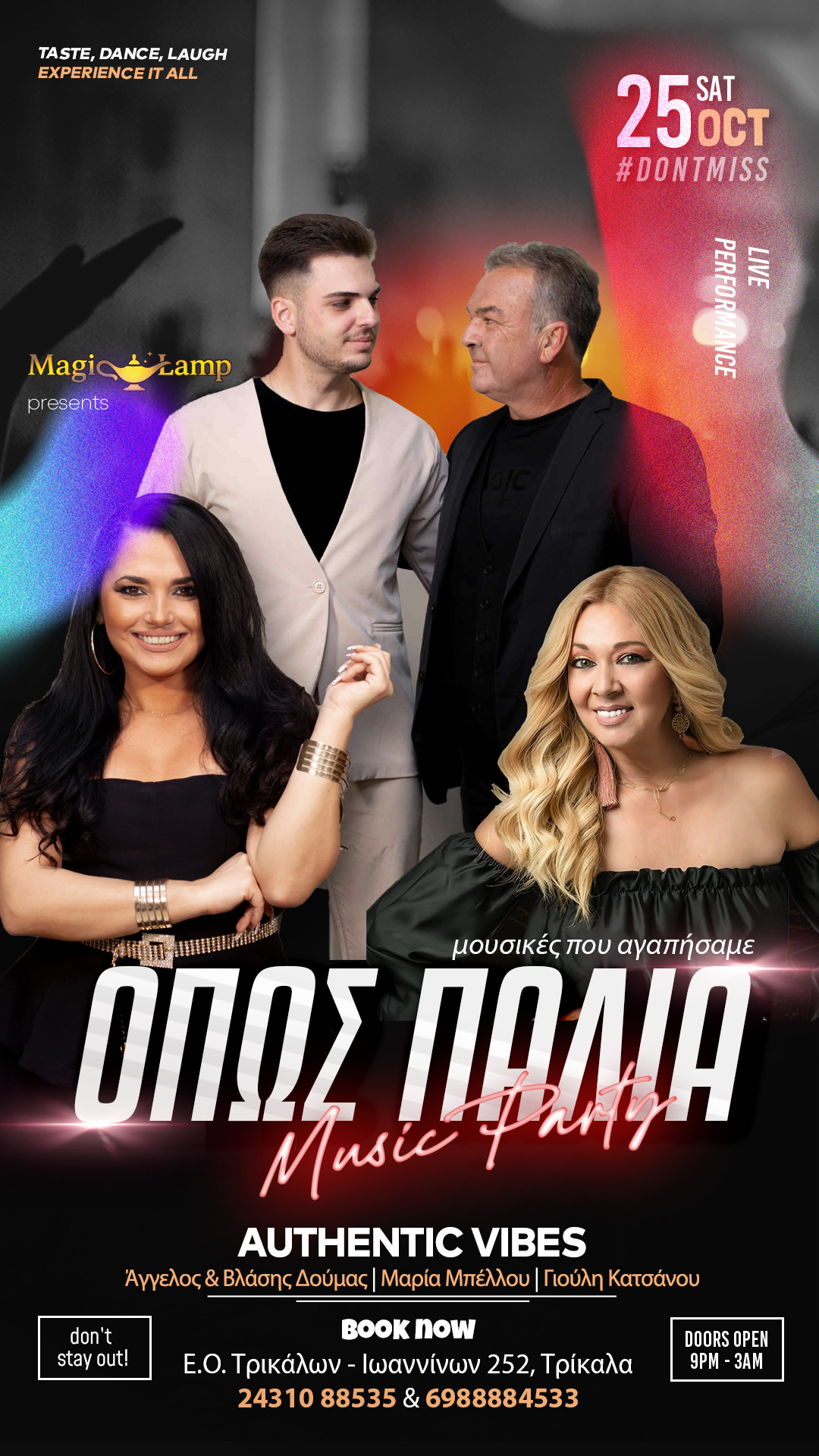 Στα Τρίκαλα, εκεί όπου η παράδοση και η μουσική έχουν πάντα ξεχωριστή θέση, ετοιμάζεται να ανοίξει ένας χώρος που υπόσχεται να μας ταξιδέψει σε άλλες εποχές τότε που η διασκέδαση είχε ψυχή, παρέα και μεράκι. Το νέο μουσικό στέκι «Όπως Παλιά» έρχεται να αναβιώσει την παλιά, αυθεντική ελληνική διασκέδαση, με ζωντανή μουσική, ποιοτικό φαγητό και κρασί. Διεύθυνση: ΕΟ Τρικάλων – Ιωαννίνων 252, Τρίκαλα 42100 Ώρες λειτουργίας: Σάββατο βράδυ από τις 9:00 μ.μ.
