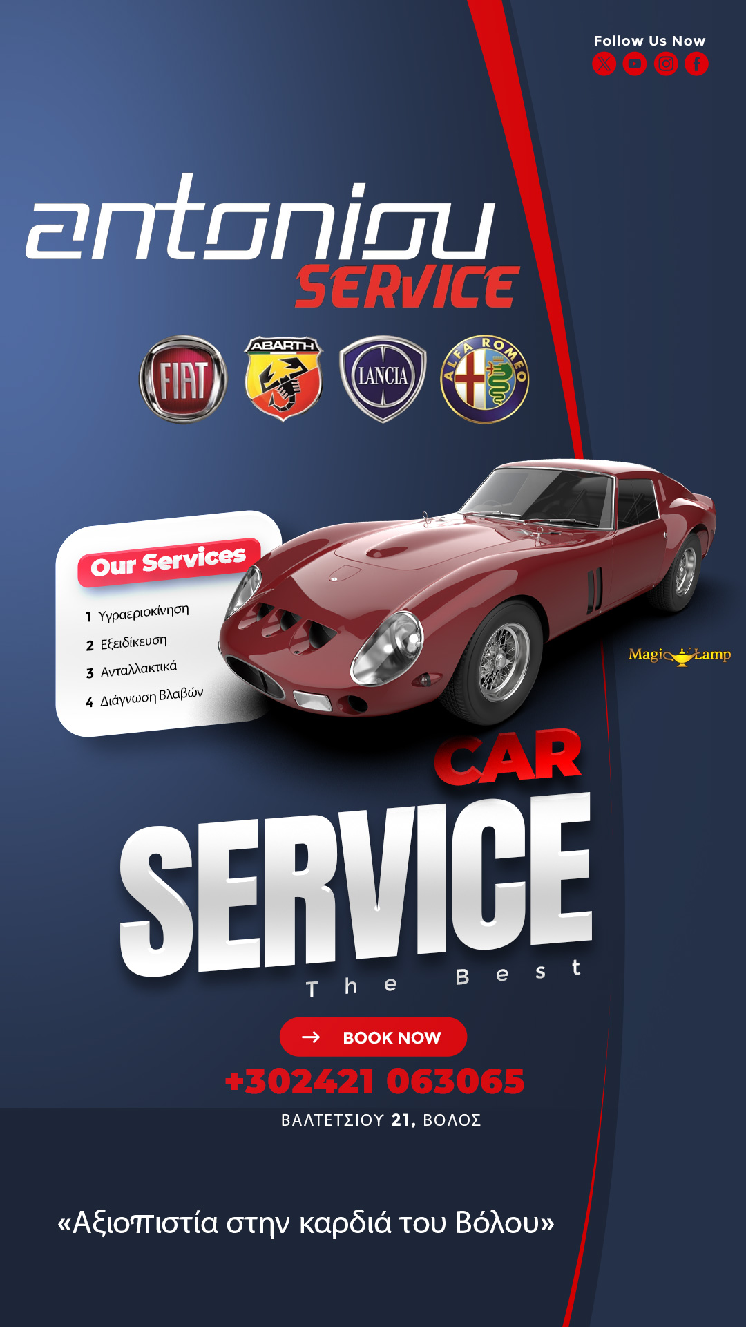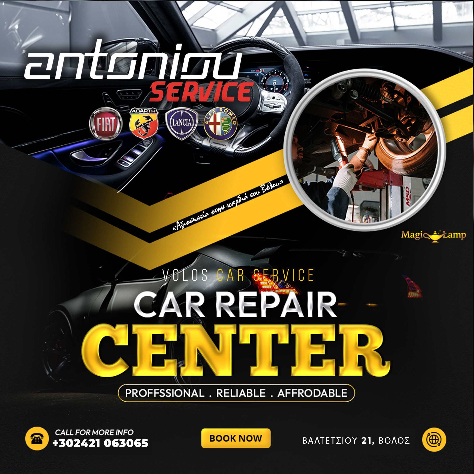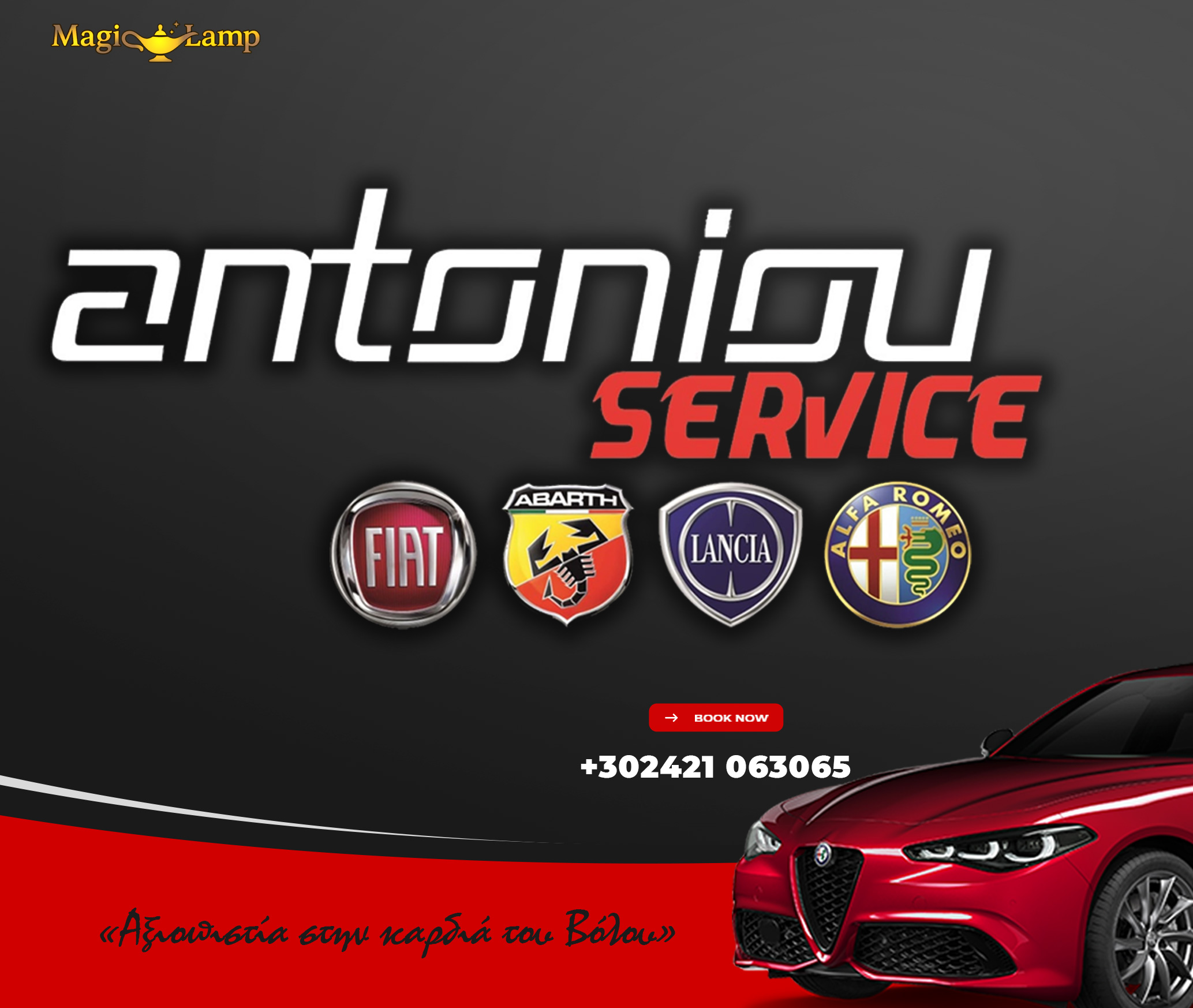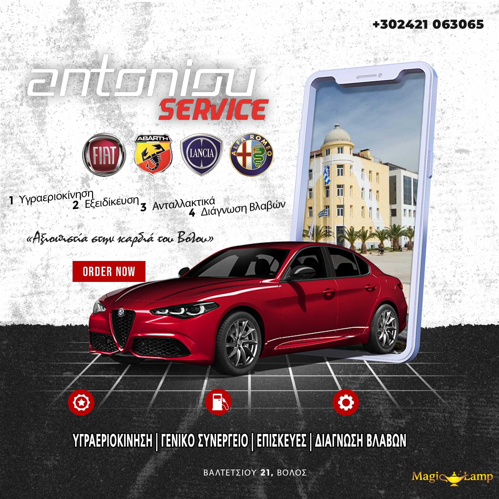 Συνεργείο Αυτοκινήτων Αντωνίου Βόλος – Service Ανταλλακτικά Βελτιώση : Καλώς ήρθατε στο Συνεργείο Αντωνίου στο συνεργείο όπου το αυτοκίνητό σας αντιμετωπίζεται με επαγγελματισμό και μεράκι. Εξειδίκευση στα μοντέλα Fiat, Alfa Romeo, Lancia. Υγραεριοκίνηση με εγγύηση 2 ετών.Με ένα ραντεβού θα σας δώσουμε διάγνωση χωρίς υποχρεώσεις.