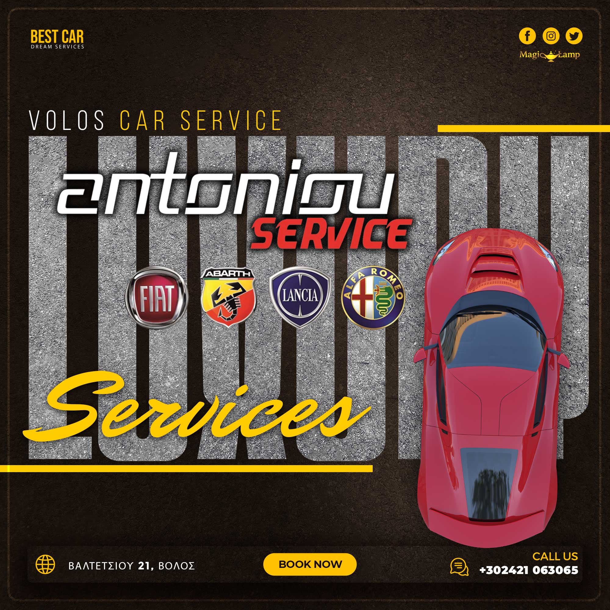 Στον Βόλο, στην οδό Βαλτετσίου 17-21, βρίσκεται το εξειδικευμένο συνεργείο Αντωνίου Αναστάσιος, που έχει ως αποστολή να προσφέρει υπηρεσίες υψηλής ποιότητας στην επισκευή και συντήρηση αυτοκινήτων. Ειδικευόμαστε κυρίως σε μοντέλα Fiat, Alfa Romeo, Lancia αλλά δεν περιοριζόμαστε μόνο σε αυτά. Διαθέτουμε σύγχρονο εξοπλισμό, έμπειρο τεχνικό προσωπικό και προσφέρουμε ολοκληρωμένες λύσεις (διάγνωση, συντήρηση, μετατροπές, υγραεριοκίνηση, κ.ά.).